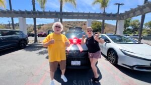 The proud new owners with their newest baby, a shiny new ’25 Cross hybrid Nightshade with a red bow. Thanks to Capistrano Valley Toyota for